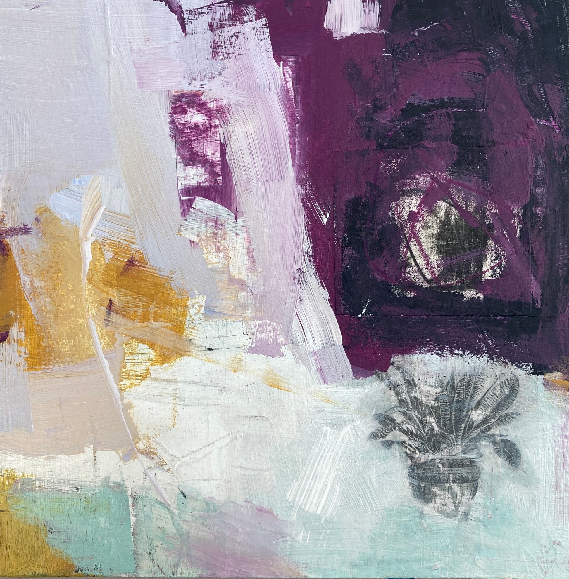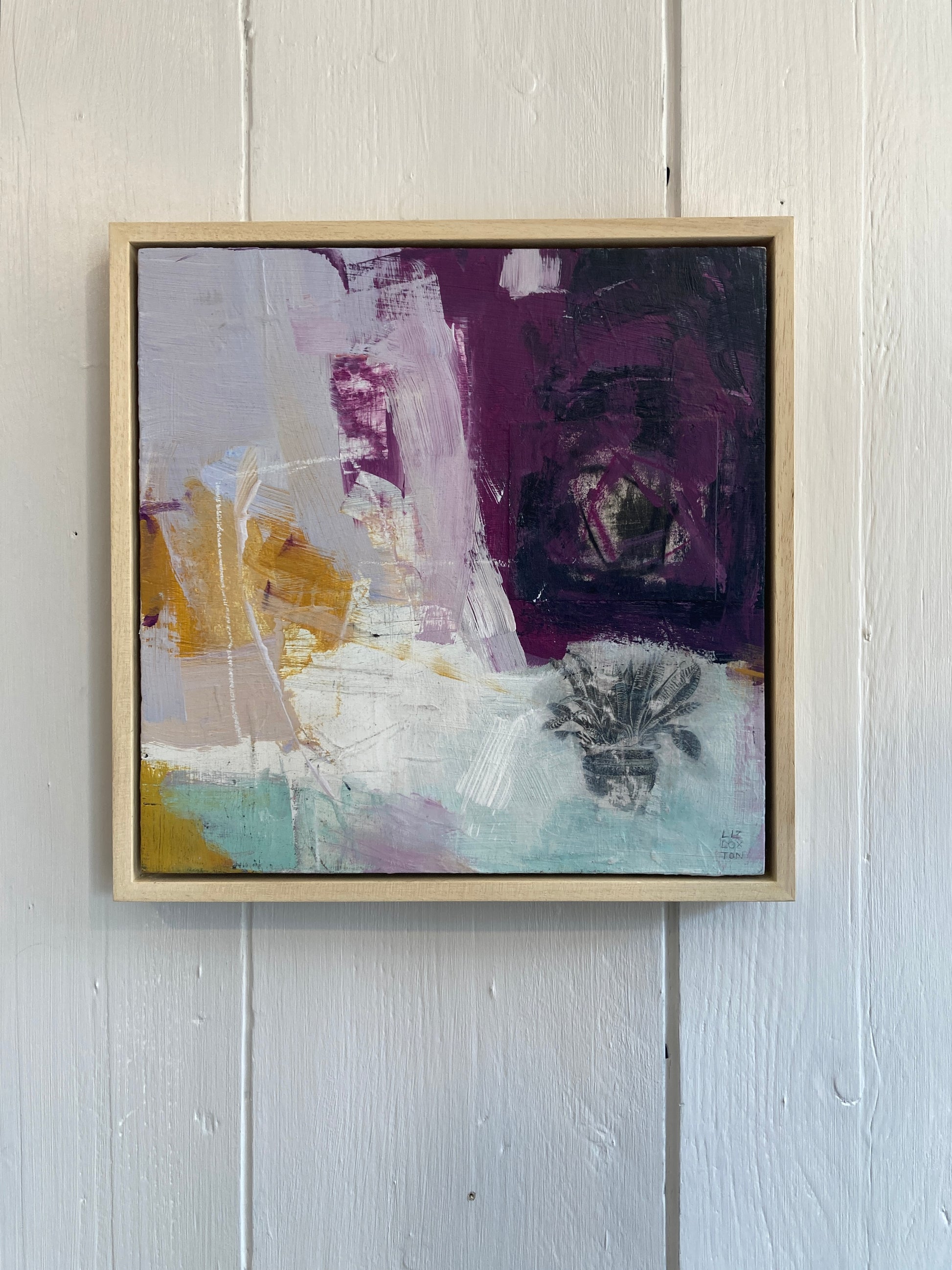 Acrylic and mixed media on board, framed in light wood. 32.5cm x 32.5cm